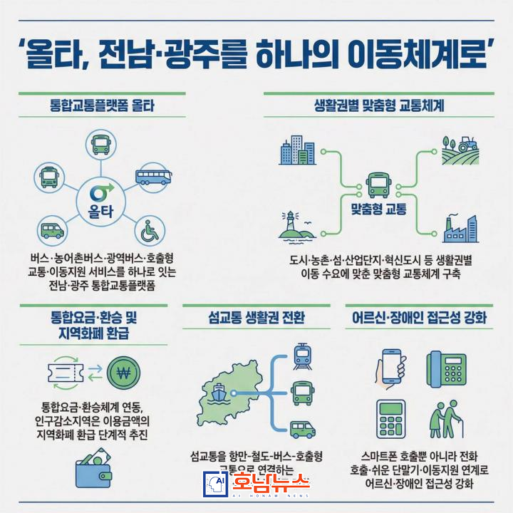 전남·광주 통합특별시가 ‘이동권 혁명’의 전환점을 맞고 있다. 단순한 교통 개선을 넘어, 시민의 이동 자체를 국가 서비스 수준으로 끌어올리는 ‘AI 기반 통합교통체계’가 본격 제시됐다.