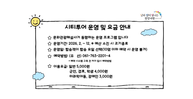 광양시티투어는 사전 예약제로 운영되며, 출발일 기준 3일 전 예약을 마감하고 10명 이상 모집 시 출발한다.