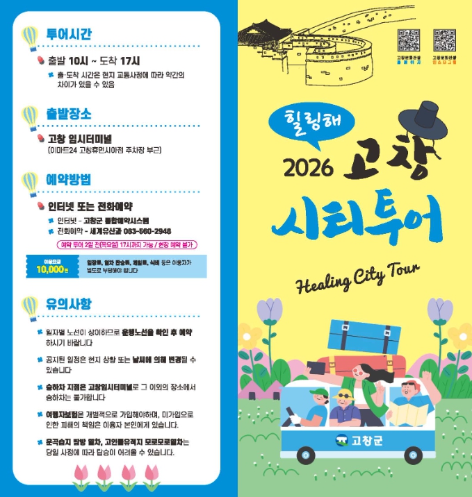 한편, '힐링해' 고창 시티투어버스는 사전 예약제로 운영되며, 고창군 홈페이지 통합예약시스템 및 전화 예약을 통해 예약할 수 있다.