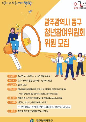 동구는 청년의 목소리를 구정에 폭넓게 반영하고, 청년이 정책 형성과 집행 과정에 실질적으로 참여할 수 있는 기반을 마련하기 위해 이번 모집을 추진한다.