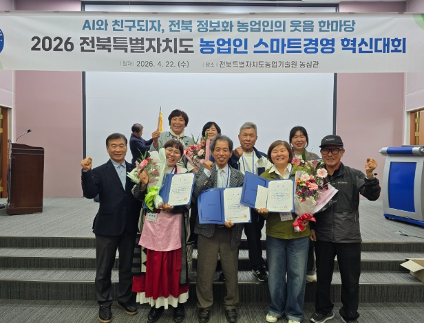 이번 『2026년 전북특별자치도 농업인 스마트경영 혁신대회』는 지난 22일 전북특별자치도 농업기술원에서 열렸으며 김제는 2년 연속 다수 수상이라는 우수한 성과를 이뤄냈다.