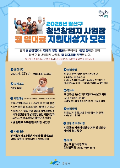 제출 서류와 지원 대상, 기준 등 ‘2026년 광산구 청년 창업자 사업장 월 임대료 지원사업’에 관한 자세한 사항은 광산구 누리집 공고문에서 확인할 수 있다.
