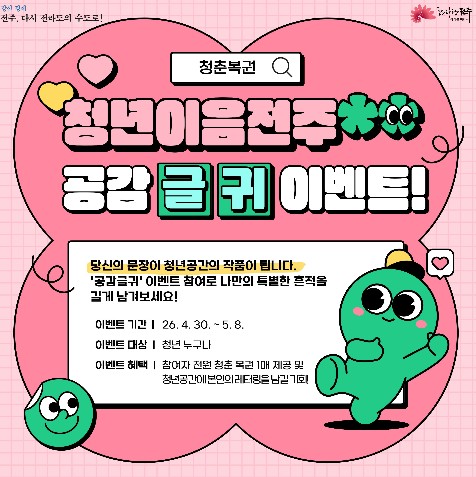 이번 이벤트는 청년의 이야기가 담긴 공감 문구를 공간에 녹여, 청년이음전주를 청년 간 공감과 연결을 이끄는 친화공간으로 조성하기 위해 추진된다.