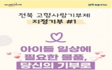 전라북도도 박인석 기자2025. 10.17[뉴스채널]전북특별자치도가 도민이 체감할 수 있는 첫 지정기부사업을 발굴하고 20일부터 본격적인 모금에 나선다. 지정기부사업은 기부자가 고향사랑기부금을 자신이 원하는 사업을 직접 지정해 기부할 수 있는 제도로, 주민이 필요로 하는 사업에 직접 기여하고 그 성과를 눈으로 확인할 수 있다는 점에서 참여형 기부문화 확산의 새로운 계기가 될 전망이다. 이번에 추진되는 첫 지정기부사업은 ▲‘가정위탁 아동용품 구입비 지원사업’ ▲‘장애인 교통약자 이동편의 증진지원사업’ 이다. ‘가정위탁 아동용품 구입비 지원사업’은 부모의 보호를 받지 못...