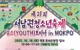 목포 박인석 기자2025. 10.14[뉴스채널]제21회 서남권청소년축제가 ‘유스(YOUTH)토피아 in MOKPO’를 주제로 오는 10월 18일(토) 오후 1시부터 5시까지 목포 로데오광장 일대에서 열린다. 이번 행사는 목포시가 주최, 서남권청소년축제추진위원회가 주관, 전라남도교육청이 후원하며, 전남 서남권 청소년과 청소년지도자, 시민 등 1,000여 명이 참여할 예정이다. 축제는 식전공연과 ▲경연프로그램(StageON) ▲체험부스운영(PlayON) ▲참여형 프로그램(7종) 등 다채로운 내용으로 진행된다. 식전공연에서는 목포백련초등학교 6학년 임사랑 학생의 국악...