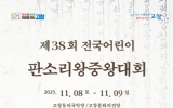 오피니언 박인석 기자2025. 10.13[뉴스채널]전북 고창군이 올해의 어린이 판소리 왕중왕을 가리는 ‘제38회 전국 어린이판소리왕중왕대회’ 참가자를 오는 11월7일까지 모집한다. 차세대 어린이 판소리 명창을 발굴 육성하고 판소리 여섯 바탕 사설을 집대성하신 동리 신재효 선생의 문화예술사적 업적을 기념하며 유업을 계승하기 위해 고창군과 KBS전주방송총국이 공동주최하고 (사)동리문화사업회가 주관한다. 대회는 고창 동리국악당에서 11월8일 예선을 거쳐 이튿날(9일) 축하 공연과 병행하여 예선을 통과한 7명의 어린이가 본선 경연을 한다. 왕중왕전은 KBS전주방송총국...
