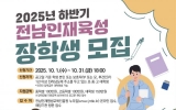 전라남도 박인석 기자2025. 10.13[뉴스채널]전라남도와 전남인재평생교육진흥원은 실질적인 교육기회 보장과 미래인재로의 성장, 지역 정착을 지원하기 위한 2025년 하반기 전남인재육성 장학생을 오는 31일까지 모집한다. 신청 대상은 공고일 기준 학생 본인 또는 보호자(부 또는 모, 후견인)가 1년 이상 계속해서 전남도에 주민등록이 돼있는 초·중·고등학생과 대학생, 공고일 기준 전남도에 1년 이상 체류 중이며 남은 체류 기간이 6개월 이상인 외국인 유학생이다. 선발분야는 ▲전남인재 장학금 ▲전남정착 장학금 ▲특별지정 장학금 총 3개의 분야 15종이며, 장학생 868명...