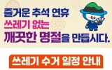 여수 박인석 기자2025. 09.26[뉴스채널]여수시는 다가오는 추석 연휴 기간 시민과 귀성객이 불편 없이 명절을 보낼 수 있도록 생활폐기물 수거 일정을 조정해 운영한다. 연휴 중 생활폐기물 수거는 ▲10월 5일 오전 5시부터 9시까지 단축 수거를 실시하며 ▲추석 당일 6일과 다음 날 7일에는 수거를 하지 않는다. 이외 ▲10월 3일, 4일, 8일, 9일은 평상시와 같이 정상 수거한다. 수거가 중단되는 휴무일에는 생활폐기물 기동처리반이 주요 도로변 수거와 긴급 민원 처리를 진행할 예정이다. 또한 시는 지난 9월 22일부터 10월 1일까지 ‘명절맞이 새단장 청소주...