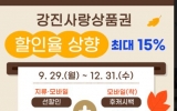 강진 박인석 기자2025. 09.24[뉴스채널]강진군은 9월29일부터 12월31일까지 강진사랑상품권 할인율을 상향 조정한다고 24일 밝혔다. 추석 명절 맞이 및 지역경제 회복을 위해 마련된 할인 혜택은 지류 및 모바일(착) 강진사랑상품권 구매 시 선할인 10%이며, 기간 중 모바일(착) 사용 시 후캐시백 적립 5%로 총 15% 할인 혜택을 받을 수 있다. 구매 한도는 월 70만 원으로 동일하다. 다만, 모바일(착) 상품권 후캐시백은 매월 1억 원을 투입할 예정으로 예산소진 시 운영이 종료되므로 혜택을 받기 위해서는 빠르게 소비하는 것이 유리하다. 관내 모바일...