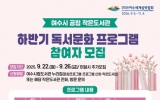 여수 박인석 기자2025. 09.22[뉴스채널]여수시는 9월 22일부터 26일까지 공립 작은도서관 ‘2025년 하반기 독서문화 프로그램’ 수강생을 모집한다. 이번 프로그램은 유아부터 성인까지 다양한 연령층이 참여할 수 있도록 총 9개로 마련됐으며 오는 10월부터 11월까지 프로그램별 총 6회씩 운영된다. 운영 작은도서관은 ▲여문늘벗(구 중부보건지소) ▲꿈을키우는(미평 선경 3차 아파트) ▲화양열린(화양면민회관 2층) ▲청솔글누리(돌산 청솔 2차 아파트) 등 4곳이다. 성인 대상 프로그램은 ▲시니어, 그림책 속 색감의 조화를 이루다 ▲글이 머무는 수채화 ▲나를 쓰...
