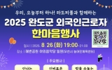군산 박인석 기자2025. 08.18[뉴스채널]완도군은 8월 26일 오후 7시, 완도 해변공원 야외 음악당에서 외국인 근로자와 주민이 함께 어우러지는 『2025 외국인 근로자 한마음 행사』를 개최한다. 군은 지난 2022년부터 필리핀, 라오스 등과 해외 인력 확보를 위한 업무 협약(MOU)을 체결해 안정적인 외국인 노동력 유치에 힘써왔으며, 결혼이민자 정착 지원, 다문화가정 교육, 외국인 근로자 복지 등 다양한 시책을 추진 중이다. 현재 군에는 1,100여 명의 외국인 근로자가 거주하고 있으며, 그중 결혼이민자 가족의 초청을 통해 근무하고 있는 인력도 다수 포함돼...