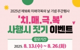 목포 박인석 기자2025. 08.12[뉴스채널]군산시치매안심센터는 ‘제18회 치매 극복의 날’을 맞아 ‘치매 극복’ 사행시 짓기 행사와 치매에 대한 모든 것을 알려주는 토크콘서트를 운영한다고 12일 밝혔다. ‘치매 극복의 날’은 매년 9월 21일로 1995년 세계보건기구(WHO)와 국제알츠하이머협회(ADI)가 가족과 사회의 치매 환자 돌봄을 새롭게 인식하기 위해 지정한 기념일이다. 이번 행사는 ▲치매에 대한 인식개선 확산 ▲치매 관리사업 홍보 ▲치매 환자·가족에게 희망적인 메시지 전달 ▲치매에 대한 사회적 이해와 ▲치매 친화적인 환경 조성 등을 위해 기획됐다. ...