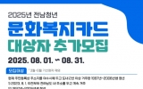 여수 박인석 기자2025. 08.04[뉴스채널]여수시는 ‘2025년 전남청년 문화복지카드 지원사업’ 대상자를 8월 한 달간 추가 모집한다. ‘전남청년 문화복지카드 지원사업’은 지역 청년에게 연간 25만 원의 문화복지비를 지원해 문화 향유 기회를 확대하기 위한 사업으로, 2022년부터 시행되고 있다. 여수시는 올해 상반기 16,649명의 청년을 대상자로 선정했으며, 이번 추가 모집을 통해 상반기에 신청하지 못한 청년 2,203명을 추가로 선정할 계획이다. 신청 대상은 2023년 8월 1일 이전부터 전남 도내에 2년 이상 주소를 두고 있는 1997년부터 2006년...