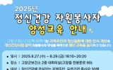 오피니언 박인석 기자2025. 08.04[뉴스채널]고창군정신건강복지센터가 오는 8월27~29일 고창군보건소 2층 대회의실에서 실시하는 ‘정신건강자원봉사자 양성교육’에 참여 주민을 모집한다. 모집 인원은 선착순 30명이며, 신청은 22일까지 전화 또는 홈페이지를 통해 가능하다. 교육은 총 6시간의 이론 중심 과정으로 구성됐으며, ▲아동·청소년 정신건강의 이해 ▲정신질환별 특성(우울증, 조현병, 강박증 등) ▲보고듣고말하기 생명지킴이 양성교육 등 다양한 정신건강 주제를 다룬다. 강의는 정신건강의학과 전문의와 정신건강복지센터 실무자가 함께 진행해 이론과 실제를 아우르...