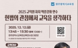 광주광역시 박인석 기자2025. 12.02[AI 호남뉴스]광주시교육청은 오는 12일 오후 1시45분부터 광주시교육청교육연수원 대강당에서 문형배 전 헌법재판관을 초빙해 ‘교직원 자치 역량 강화 연수’를 개최한다. 이번 연수는 시교육청의 ‘헌법과 민주주의 수호 기간’을 맞아 헌법적 가치에 기반한 민주적 학교 자치 실현을 위해 마련됐다. 문 전 재판관은 ‘헌법의 관점에서 교육을 생각하다’라는 주제로 민주적 교육 현장에서 요구되는 자율성·책임성·민주성의 의미를 소개할 예정이다. 시교육청은 이날 연수에 앞서 헌법 수호의 의미를 다지기 위한 ‘헌법 조항 쓰기 릴레이’ 행사도...