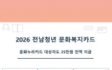 해남 박인석 기자2025. 11.18[뉴스채널]전라남도는 2026년부터 전남 청년 문화복지카드 사업 추진 시 경제적 취약 계층(기초생활수급자·차상위계층)이 수혜를 받는 문화누리카드 지급자에게도 25만 원 전액을 지급한다고 밝혔다. 전남청년 문화복지카드는 청년의 문화 향유 기회를 넓히고 자기 계발을 돕기 위해 2022년부터 시행하고 있다. 전국 최초로 소득 기준 없이 청년에게 문화복지비를 10년간 최대 250만 원을 지원한다. 이를 통해 청년은 공연 관람, 학원 수강, 도서 구입, 체육시설 이용 등 다양한 문화·복지 혜택을 받을 수 있다. 기존 전남청년 문화...