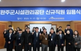 전주 박인석 기자2025. 11.17[뉴스채널]완주군시설관리공단이 17일, 신규직원 임용식을 갖고 2026년 위탁 사업대비를 위한 업무인수인계 절차에 본격 돌입했다. 공단은 2026년 1월 예정된 체육시설(수영장), 고산북부권 공영마을버스 운영 위탁 전환에 대비해 현장 인수인계와 사전 운영준비를 위한 일반직 행정분야 직원 8명을 우선 임용했다. 완주군시설관리공단 2층에서 열린 임용식은 ▲임용장 수여 ▲청렴 서약서 낭독 ▲ESG 경영선포 ▲공단 주요 사업안내 순으로 식이 진행됐다. 신규직원들이 조직의 역할과 책임을 이해하고 함께 성장해 나갈 수 있도록 공단의 ...