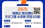 나주 박인석 기자2026. 04.14[AI 호남뉴스]전남 함평군이 상반기 청년센터 프로그램 참여자를 모집한다. 함평군은 14일 “2026년 상반기 청년센터 프로그램 참여자를 2차 모집한다”고 밝혔다. 지원 대상은 공고일 기준 함평군에 주민등록을 두고 거주하고 있는 19세 이상 49세 이하 청년이다. 프로그램별로 최대 16명을 선착순 모집한다. 모집 대상 프로그램은 ▲공인중개사 자격증반 ▲온라인 마케팅 창업 교육 ▲영상 편집 교육 ▲성인 영어 회화반 등 총 4개다. 참여 희망자는 구비서류를 갖춰 네이버 폼 또는 전자우편으로 신청하면 된다. 군은 신청자...