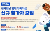 고창 박인석 기자2026. 03.05[AI 호남뉴스]고창군이 근로 청년의 자산형성을 지원하고 안정적인 지역정착 기반을 마련하기 위해 ‘2026년 전북청년 함께 두배적금’ 참여자를 모집한다고 밝혔다. ‘전북청년 함께 두배적금’은 청년이 매월 10만원을 2년간 적립하면 전라북도와 고창군이 동일 금액을 매칭 지원하는 사업으로, 만기 시 최대 500만원의 목돈을 마련할 수 있는 청년 자산형성 지원사업이다. 모집기간은 오는 16일까지이며, 모집인원은 30명이다. 신청대상은 공고일 기준 고창군에 거주하는 18세부터 39세 이하의 근로 청년으로, 가구 기준 중위소득 140...