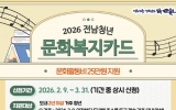 순천 박인석 기자2026. 02.11[AI 호남뉴스]순천시는 청년들의 문화생활 향유 및 자기계발 활동을 지원하기 위해 2026년 전남청년 문화복지카드 지원사업 대상자를 오는 3월 31일까지 모집한다. 청년 문화복지카드는 공연관람, 학원수강, 도서구입 등 문화복지비를 1인당 연 25만 원 지원해 주는 사업이다. 지원 대상은 현재 주민등록상 주소지가 순천시이면서 2024년 2월 9일 이전부터 전남 도내에 주소를 두고 2년 이상 계속 거주하는 19~28세(1998~2007년생) 청년이다. 지난해 지원금을 받은 대상자도 올해 다시 신청해야 한다. 다만, 복지포인트를...