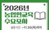 진안 박인석 기자2025. 10.22[뉴스채널]진안군(군수 전춘성)은 2026년도 진안환경농업대학 및 농업인교육 과정 선정을 위해 10월 21일부터 11월 20일까지 한 달간 진안군민과 농업인의 다양한 의견을 반영하기 위한 ‘농업인 교육 수요조사’를 실시한다. 이번 수요조사는 농업인의 교육 수요와 현장의 목소리를 직접 반영하기 위한 기초자료로 활용될 예정이다. 조사 참여는 배너·현수막·SNS 등을 통해 홍보되며, QR코드(네이버폼)를 통해 누구나 간편하게 온라인으로 참여하고 의견을 제출할 수 있다. 조사 항목은 ▲진안환경농업대학 ▲새해농업인실용교육 ▲영농정착기술교...