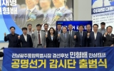 정치 ai호남뉴스 박충배 편집/칼럼/논설2026. 04.13전남·광주=AI호남뉴스】 aihnnews@kakao.com 전남·광주 통합특별시장 경선이 ‘불법 선거 의혹’으로 격랑에 휩싸인 가운데, 민형배 더불어민주당 경선후보 측이 전면 대응에 나섰다. 민형배 후보 선거대책 조직인 ‘민심캠프’는 13일 오전 ‘공명선거감시단’을 공식 출범시키고, 불법·탈법 선거 행위에 대한 전방위 대응 체계에 돌입했다고 밝혔다. 이번 조치는 최근 경선 과정에서 명의도용 문자 발송, 대리투표 의혹 등 중대한 위법 정황이 잇따라 제기된 데 따른 것이다. 단순한 논란 차원을 넘어 ‘선거 질서 자체를 흔드는 조직...