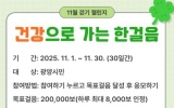 광양 박인석 기자2025. 10.21[뉴스채널]광양시는 지역 주민의 건강생활 실천을 돕기 위해 11월 1일부터 30일까지 모바일 걷기 앱 '워크온'에서 ‘건강으로 가는 한걸음 11월 걷기 챌린지’를 운영한다고 밝혔다. 이번 걷기 챌린지는 1걸음당 1마일리지가 적립되며, 1일 최대 8천 마일리지가 누적된다. 기간 중 20만 보를 달성하면 20만 마일리지가 쌓여 모바일상품권(5천 원권) 응모가 가능하다. 시는 목표 걸음을 달성한 참여자 중 추첨을 통해 800명에게 상품권을 지급할 예정이다. 참여를 희망하는 시민은 모바일 걷기 앱 ‘워크온’을 설치하고 ‘광양시 ...